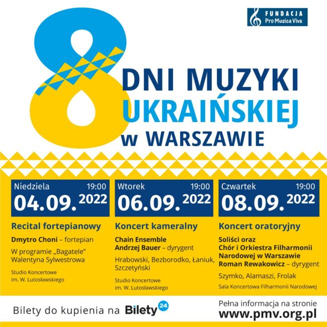 Serdecznie zapraszamy na 8 DNI MUZYKI UKRAIŃSKIEJ W WARSZAWIE! 4, 6, 8 września 2022 r. Więcej na temat festiwalu https://bit.ly/3PeNXLP Bilety na koncerty w ramach 8. Dni Muzyki Ukraińskiej: BILETY:04.09.2022 https://bit.ly/3vXtaFR 06.09.2022 [WSTĘP WOLNY pobierz wejściówkę] https://bit.ly/3piGn8g 08.09.2022 https://bit.ly/3dpKz3n