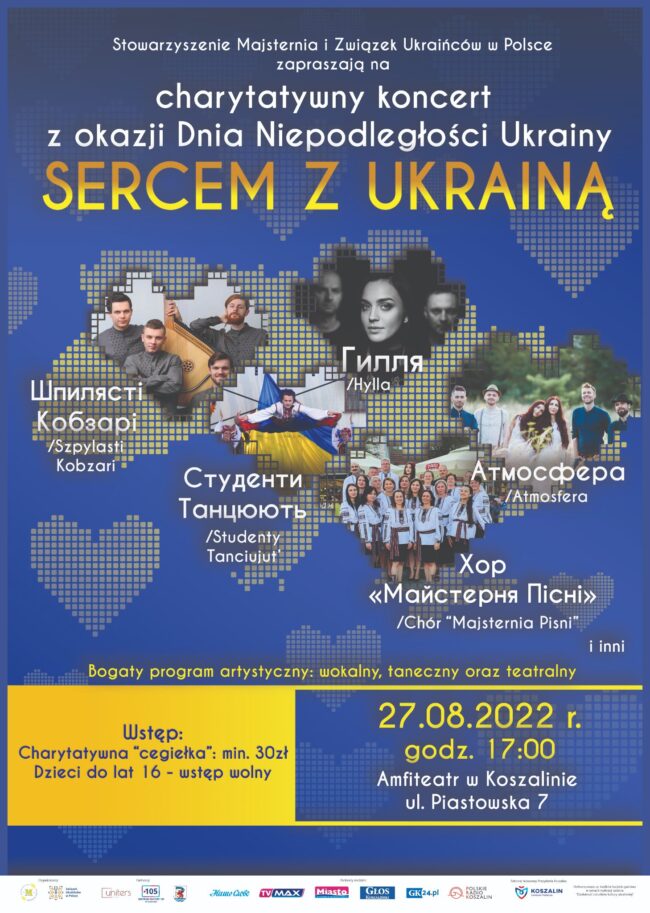 Zapraszamy do Koszalina 27.08.2022 r. na koncert charytatywny „Sercem z Ukrainą” z okazji Dnia Niepodległości Ukrainy.
