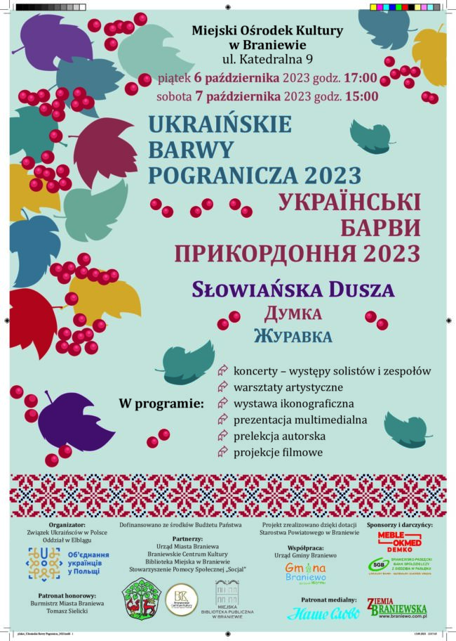 Związek Ukraińców w Polsce Oddział w Elblągu zaprasza na Ukraińskie Barwy Pogranicza 2023 6-7 października 2023 r., Miejski Ośrodek Kultury w Braniewie, ul. Katedralna 9 W programie m.in.: – koncerty – występy solistów i zespołów– warsztaty artystyczne– wystawa ikonograficzna– prezentacja multimedialna– prelekcja autorska– projekcje filmowe