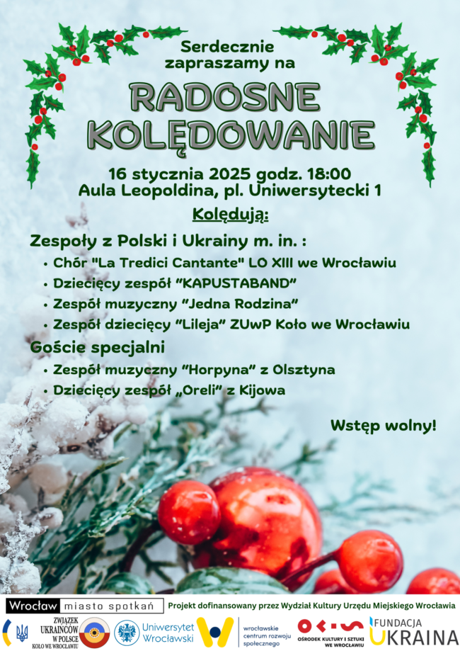 Koło ZUwP we Wrocławiu ma zaszczyt zaprosić na „Radosne Kolędowanie” 16 stycznia, godz. 18.00 w Auli Leopoldyna (Pl. Uniwersytecki 1,Wrocław). Dla Państwa wystąpią zespoły z Polski i Ukrainy: m.i.: „KapustaBand”, „Jedna Rodzina”,”Oreli”.Gwiazda wieczoru będzie zespół folklowo-rokowy „Horpyna”. Wstęp wolny!