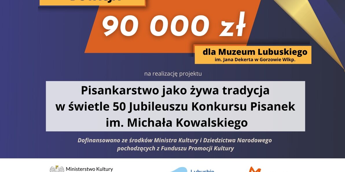 Miło nam poinformować, że Muzeum Lubuskie im. Jana Dekerta w Gorzowie Wielkopolskim otrzymało dotację dotyczącą projektu pt. Pisankarstwo jako żywa tradycja w świetle Jubileuszu Konkursu Pisanek im. Michała Kowalskiego. Wniosek do programu Kultura ludowa i tradycyjna, zgodnie z decyzją Ministra Kultury i Dziedzictwa Narodowego uzyskał dotację w łącznej wysokości 90 000 zł – 50 000 zł w roku 2023 oraz 40 000 zł w roku 2024.
