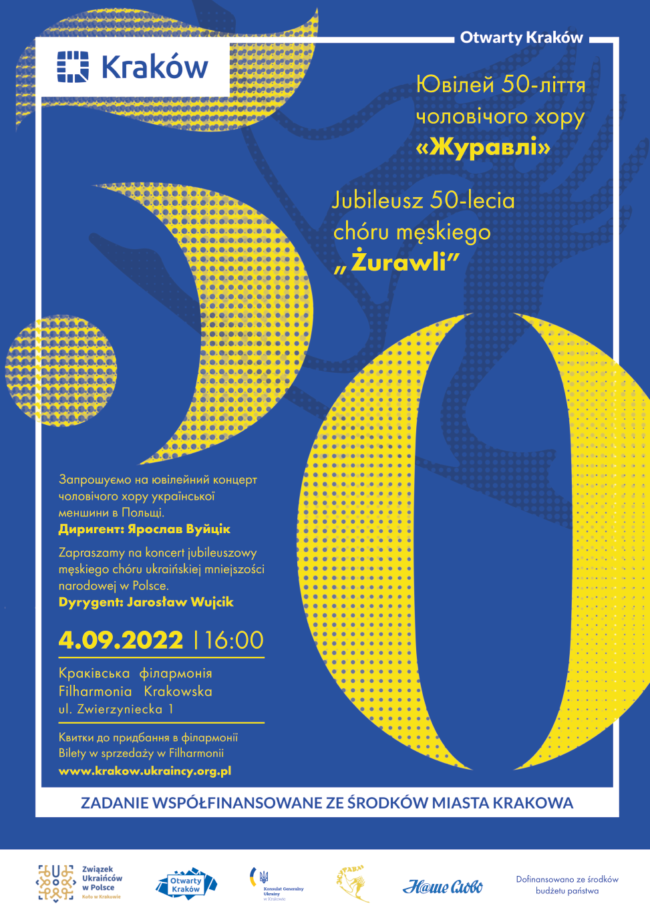 Щиросердечно запрошуємо на концерт з нагоди ювілею 50-ліття Українського чоловічого хору «Журавлі»! Краків, 4 вересня 2022 р. год. 16.00, Краківська філармонія